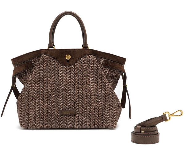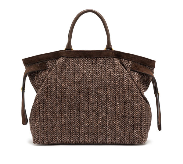 Claudette ist eine Tasche mit einer praktischen und vielseitigen Silhouette, aus geflochtenem Stroh, das einen rustikalen Charme versprüht, mit Paspeln aus Wildleder. Details aus Metall sorgen für zusätzlichen Glanz, während die beiden Lederhenkel und der verstellbare Trageriemen eine doppelte Tragemöglichkeit bieten: in der Hand oder als Crossbody. Perfekt für einen sommerlichen Touch, elegant und funktional.